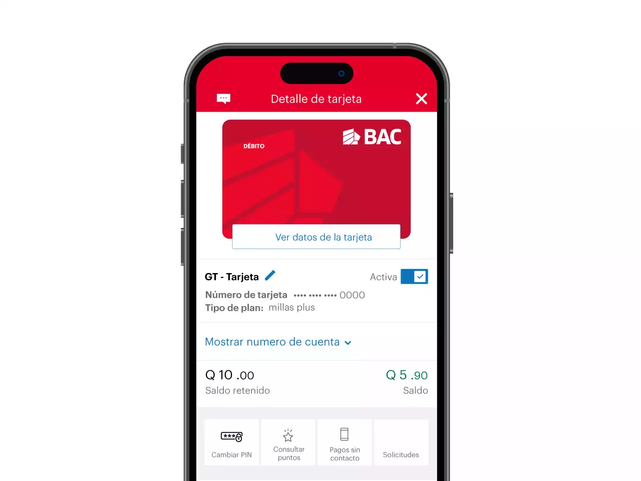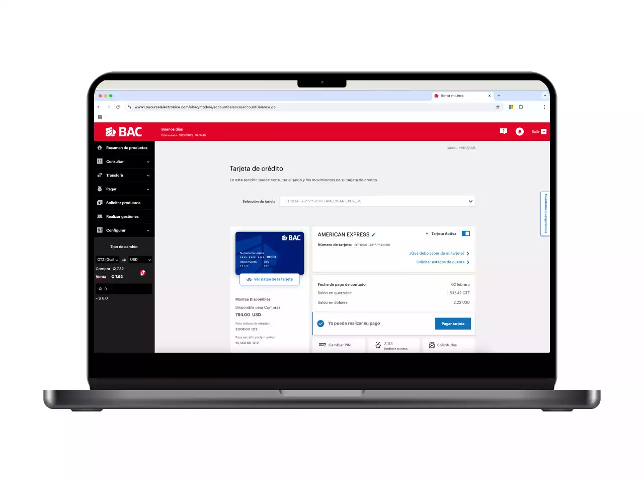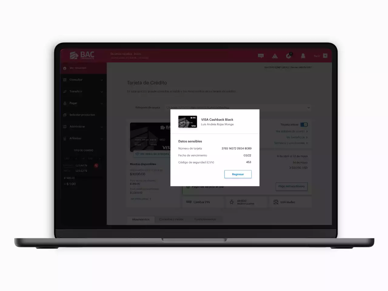 Ahora comprar por internet, nunca fue tan fácil. Al ingresar al detalle de tu tarjeta de crédito, podrás seleccionar la opción de ver datos de tarjeta. Al realizar la selección, se generará el CBAC y podrás visualizar el número de tarjeta, CVV y le fecha de vencimiento. Si no posees CBAC, se te solicitará el método de seguridad respectivo. Aplica para tarjetas de crédito y débito.