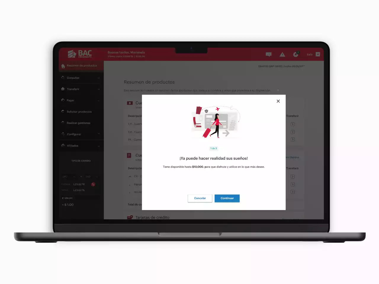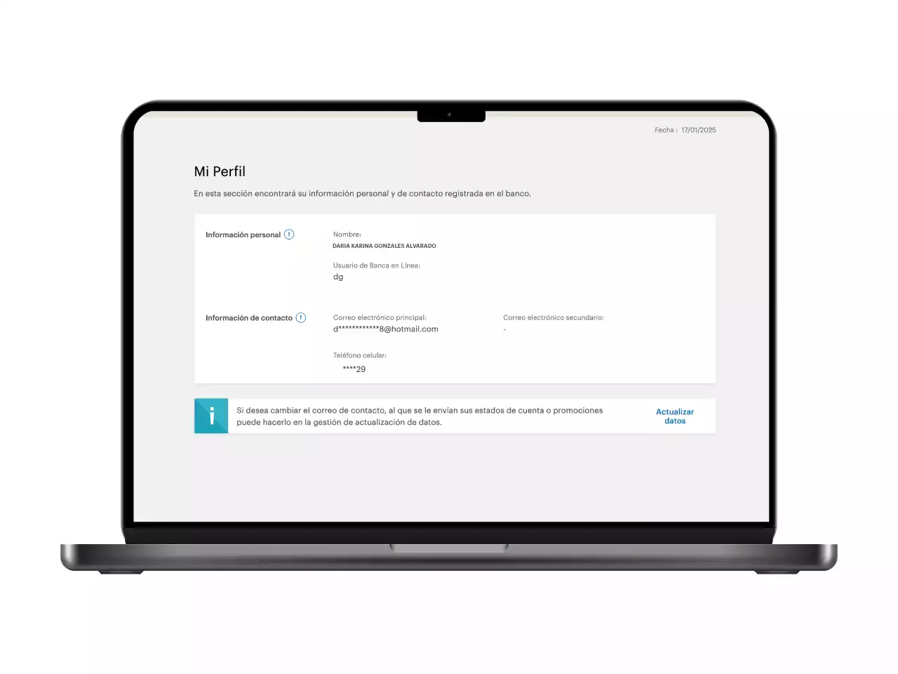 Podrás realizar una actualización de tus datos personales (teléfono móvil, correo electrónico, dirección de residencia) y laborales. Recuerda que estos datos deben actualizarse periódicamente para garantizar que podamos comunicarte de manera apropiada acerca de tus productos, gestiones y servicios bancarios BAC.