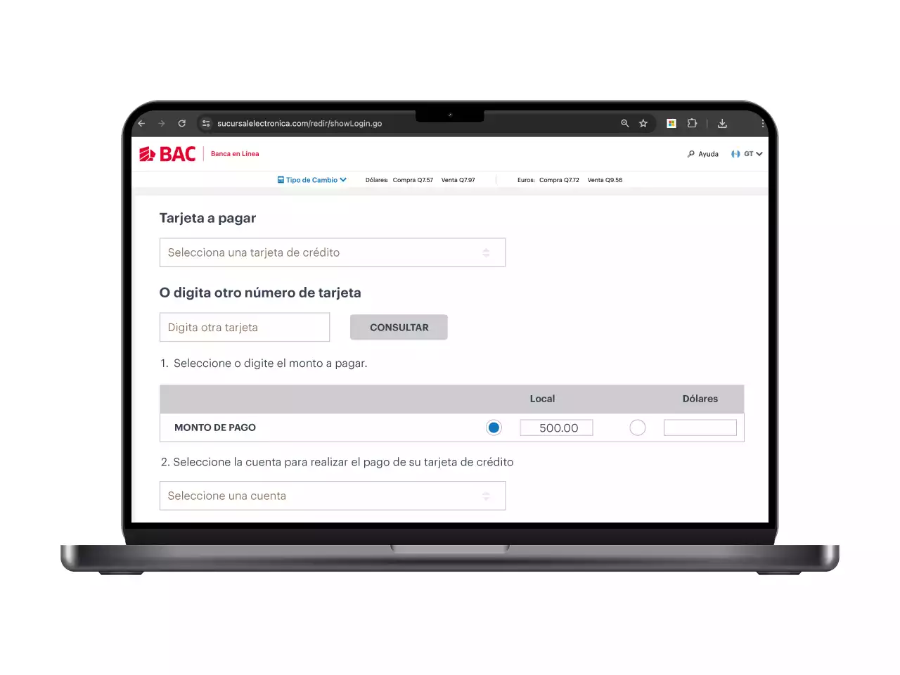 Paga el monto mínimo, monto de contado o montos extraordinarios de tu tarjeta de crédito o la de un tercero.