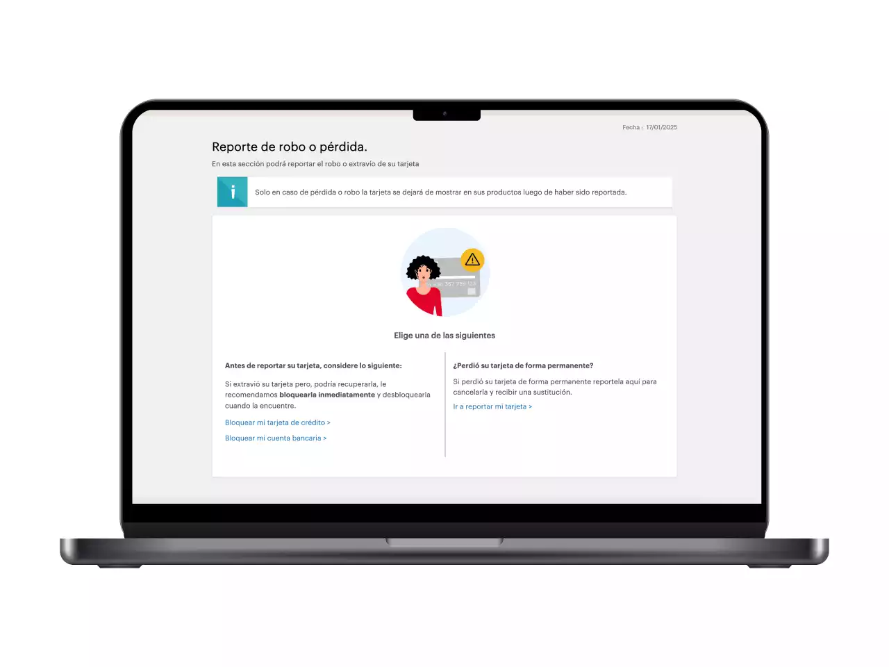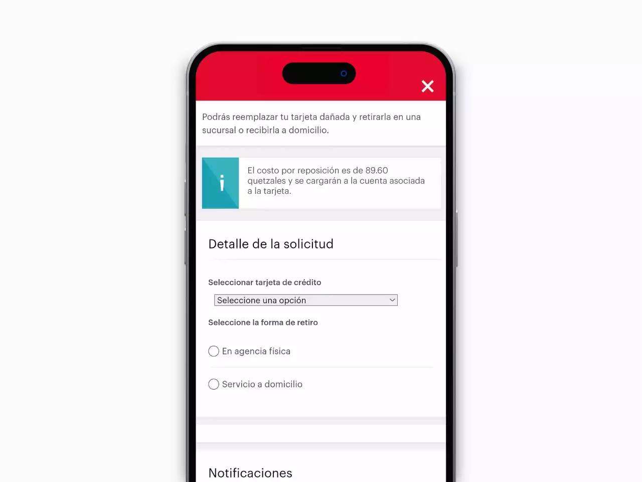 Si tu tarjeta de crédito se encuentra dañada podrás solicitarla en línea, y el reemplazo será enviada a tu domicilio o para retirar en una sucursal de tu preferencia. Únicamente te solicitaremos seleccionar la tarjeta a reemplazar, la forma de retiro, y te enviaremos una notificación con la información de la gestión.